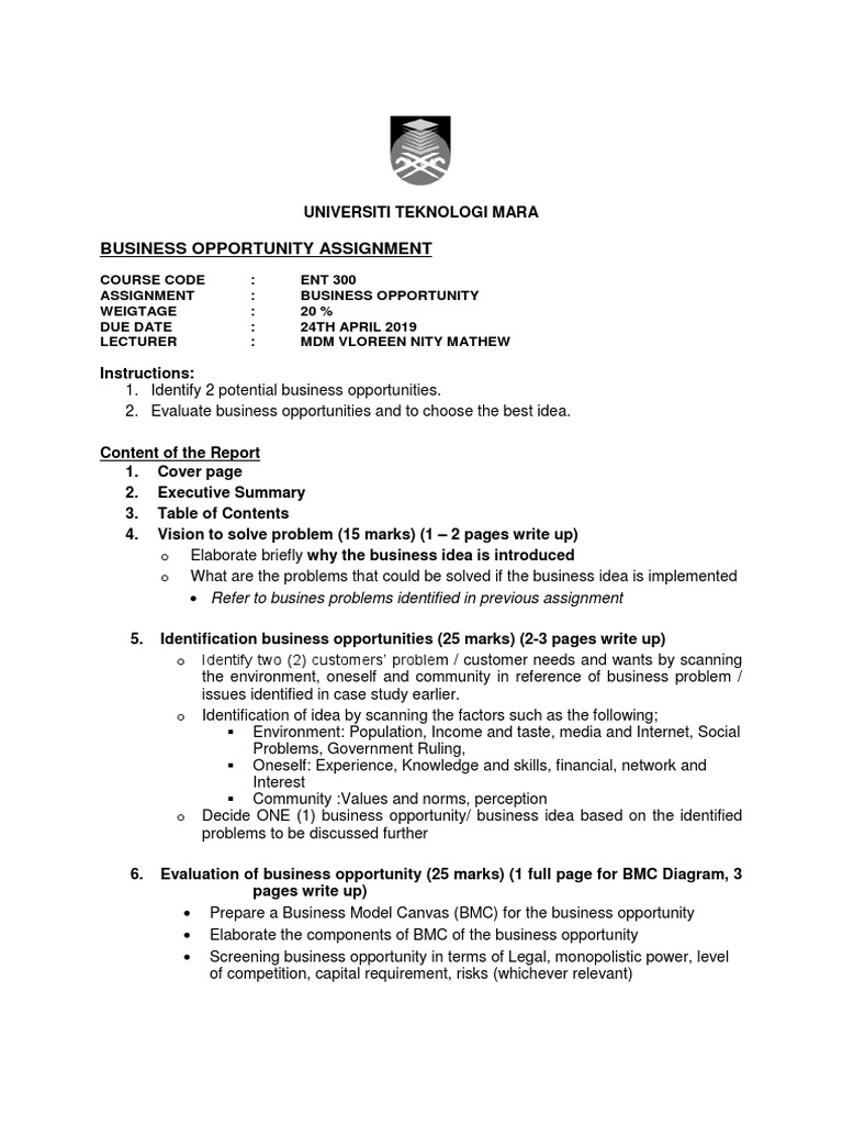 2019244716 nur aisyah alya bt ramzan. View individual assignment ent300 business opportunitydocx from ent 300 at universiti teknologi mara. The report must be submitted in a softcopy form pdfwords and rename using students full name.
